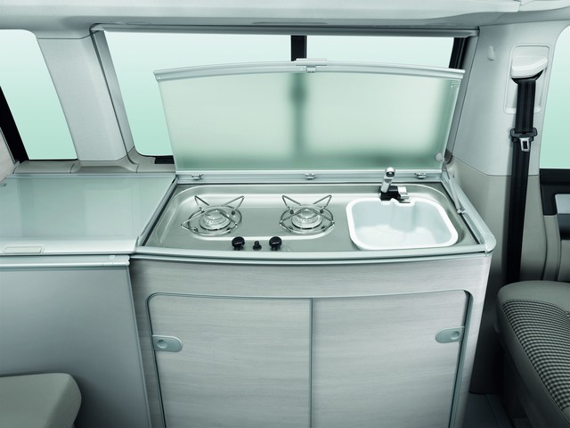 The interior seating can also be adjusted in different ways to create a dining space within the California. The two front seats can be turned 180 degrees, while the rear seat bench can slide along rails. Create enough space and you can deploy a dining table just by the kitchen and sink.