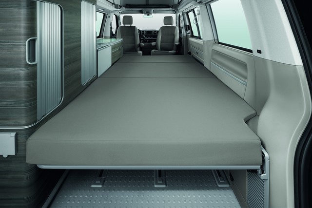 When it comes to sleeping in the campervan, the California can fit up to four beds. There’s an upper bed section which is the part of the car that looks like a tent sitting on top of the VW. Two beds can fit up here, while lower down, the rear seats can be folded flat to allow two mattresses to be put on a wooden slatted base.