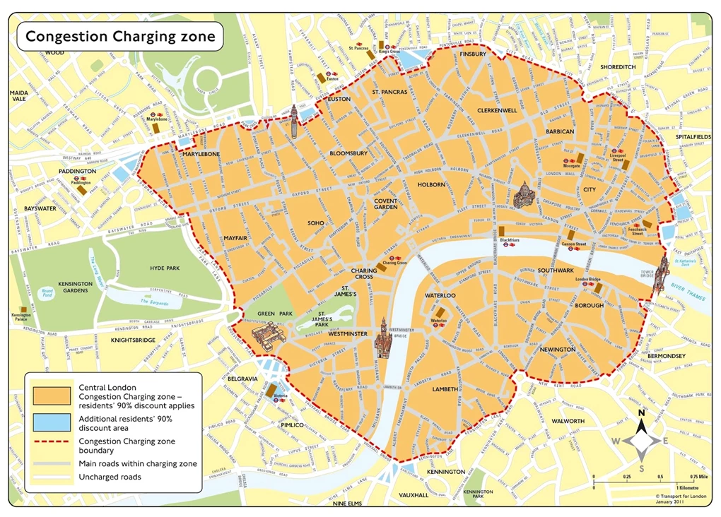 As London is one of the most densely populated cities in the world, the fee is intended to reduce high traffic flow in the central area and increase investment funds for London’s Transport System.
