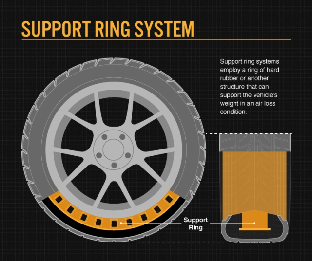 Run flat tyres with a self-supporting system feature reinforced sidewall construction. The extra layers on the tyre’s sidewall can support the vehicle for a limited amount of distance if the tyre loses air. How much distance it can cover and at what speed this reinforced sidewall can support vehicles, will be specified by the manufacturer of the run-flat tyre.